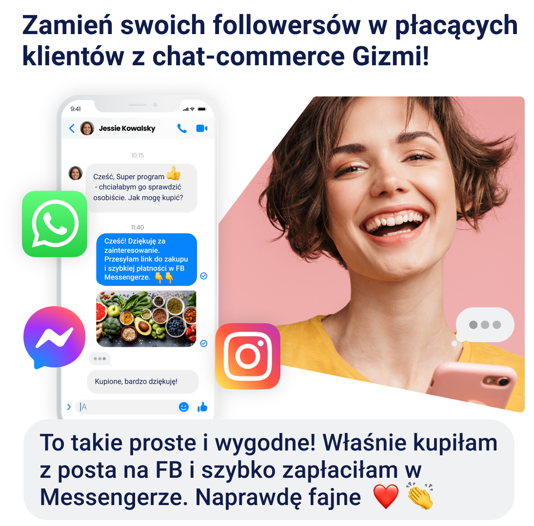 Gizmi.io to pierwsza w Polsce platforma chat-commerce, która zmienia popularne komunikatory internetowe w sklepy. Wykorzystując Facebook, Instagram czy kanał YouTube, Gizmi umożliwia sprzedaż bezpośrednio z poziomu aplikacji i znacznie przyspiesza cały proces zakupowy. Wszystko odbywa się w oknie chatu Facebook Messengera, bez dodatkowych kroków przekierowujących na stronę sklepu czy płatności online. Gizmi to szybki i łatwy sposób na zarabianie online, zgodnie z misją „Zmień swoich followersów w płacących klientów”.