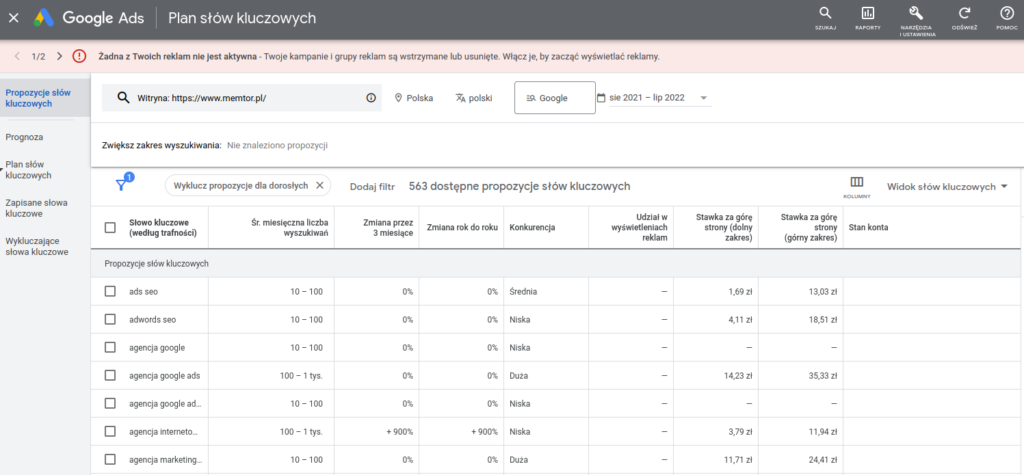 Skorzystaj z podpowiedzi słów kluczowych w Planerze Słów Kluczowych