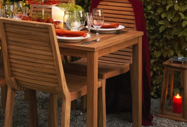 Miodowy kolor drewna teak dopełni każdą aranżację wnętrz nawiązującą do natury – ten i wiele innych projektów mebli do restauracji znajdziesz w Ogrodowym Salonie.