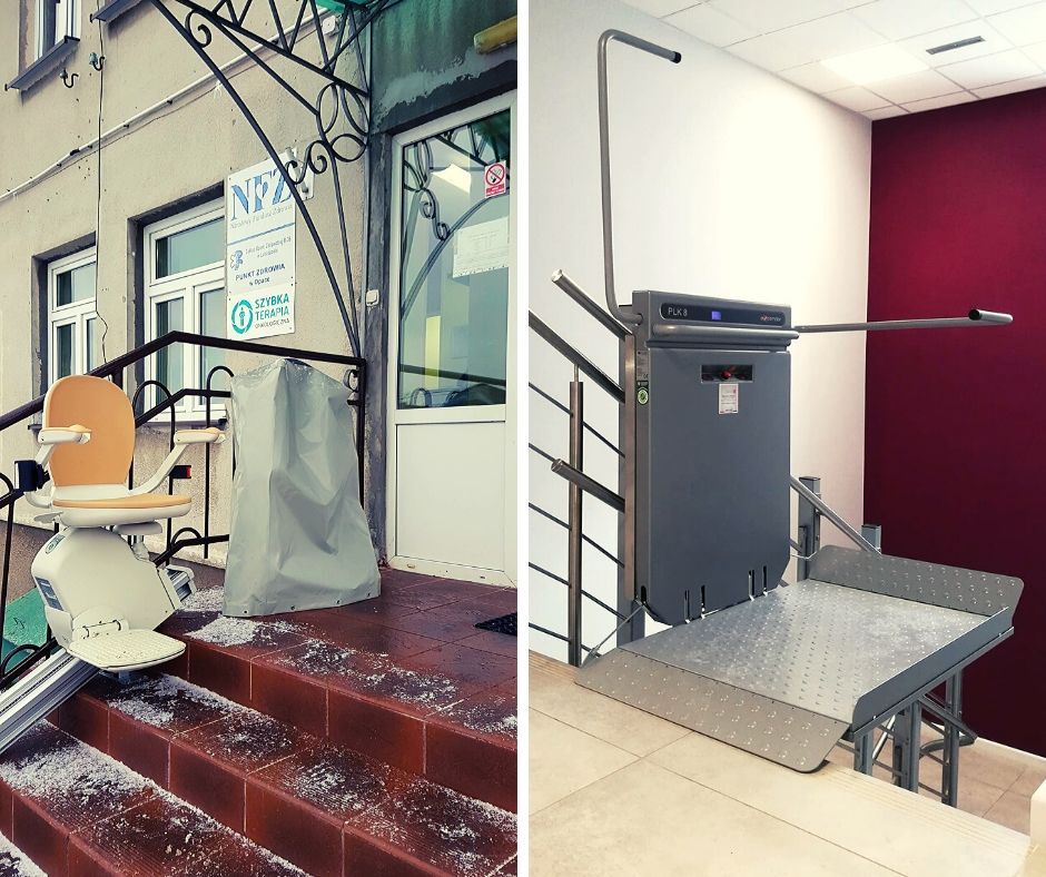 Innym sposobem na ułatwienie pacjentom pokonywania stopni jest założenie krzesełka na schody dla seniora – wewnątrz lub na zewnątrz budynku. To niewielkie urządzenie umożliwia bezpieczne transportowanie po schodach osób w podeszłym wieku, których stan zdrowia nie pozwala na samodzielne poruszanie się pomiędzy piętrami.